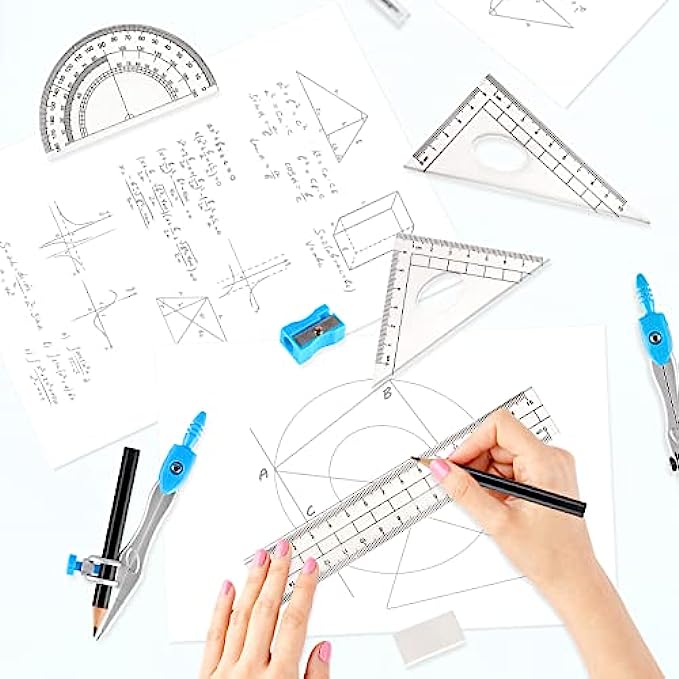• 10 Pcs Math Geometry Set: 2 Metal Study Compasses, 2 Triangles (45° & 30°/60°), 6" Ruler, 4" Protractor, Pencil for Compass, Pencil Sharpener, Eraser, Pencil Lead Refill
